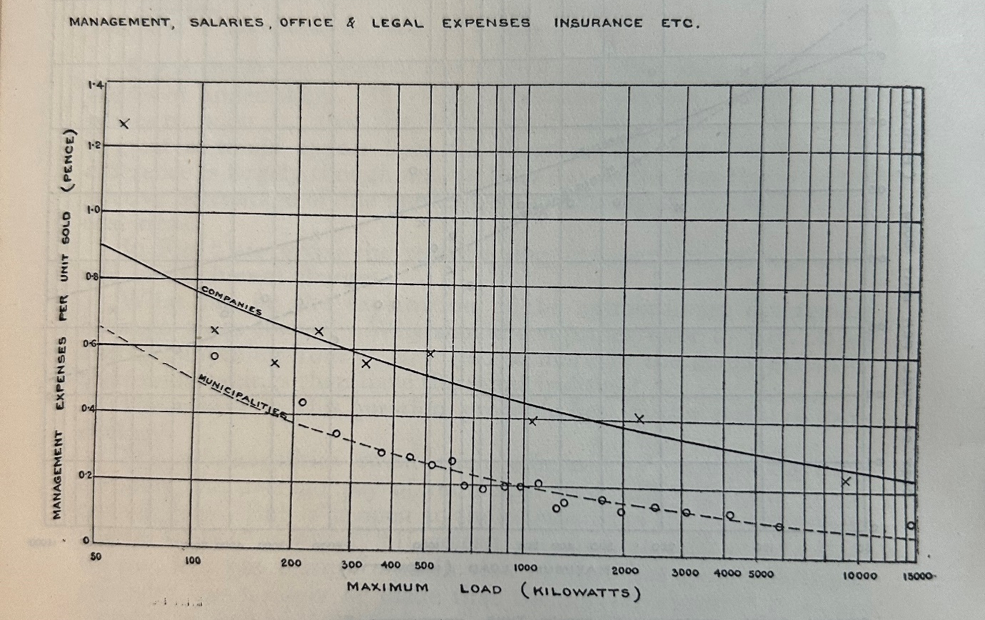 Quantitative analysis showed that municipals were more effective than private companies. In 1913 the economist Ashmore Baker undertook a remarkably modern quantitative study of the difference between private and municipal operations. Baker recognized that scale had a significant impact on the efficiency of an undertaking. His dissertation included beautiful scatter plots of maximum load capacity on the x-axis and various other cost variables on the y-axis. Below are photographs of these charts from the original document (figure 3). Municipal undertakings had a lower cost structure than companies, and passed this onto customers in lower prices. This was partly because municipals didn’t need to turn a profit, but there were other inherent advantages to municipal ownership. Municipal could also borrow at a lower rate of interest, which translated into less capex per kilowatt of maximum load. Contra the skeptics, municipals and companies had almost identical labour costs, meaning local authorities weren’t spending lavishly on workers to buy votes. Municipalities had a lower coal input cost, meaning they were either better located or better buyers. The starkest difference in cost structure was in management salaries, with companies paying significantly more for ‘leadership’. The net effect was remarkable; Baker estimated that ‘the municipalities would have earned more than 2-3x the gross profit per pound of capital than the companies’ .
