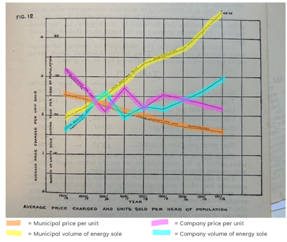 Why were municipal energy undertakings so successful? This was a vibrant debate at the time, with an eerie similarity to the debate today. One side argued that on moral grounds the municipal state should provide gas, electricity and water to the population because these were basic rights. Moreover on economic grounds, municipal organizations would be more cost effective as they could borrow at a cheaper interest rate and would not need to generate a profit to pay dividends. The other side of the debate claimed the growth of the municipals was temporary, driven by uneconomic pricing. Private undertakings were better long-term asset stewards, and the municipals were ‘living off their capital, and in a few years their plant and equipment will be worn out’ (Baker, 1913). Private companies were more effective because of specialization. Municipal entities were trying to wear ‘two hats’; council and power company. This would lead to bad outcomes, for example the municipals would pay extravagant wages to ‘vote catch’. Moreover, companies were more efficient because without the profit motive municipalities wouldn’t have an incentive to reduce costs.