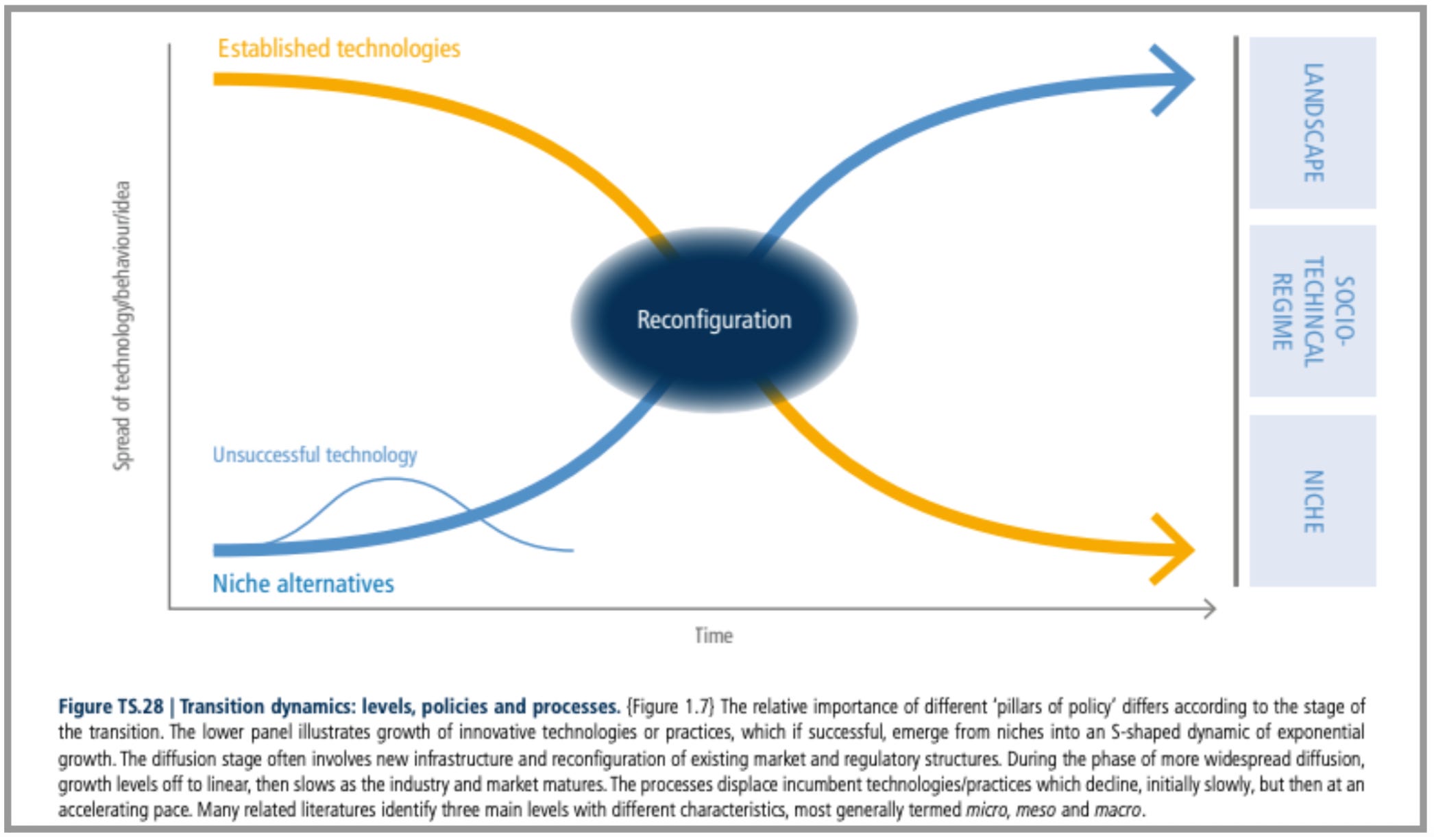 ‘S-curves’ are at the core of civilisations ‘strategy’ to prevent catastrophic climate change. The think tank Carbon Tracker summarised a common sentiment: ‘the energy transition may well be determined by the phenomenon of S-curves’. The ‘plan’ is for low carbon technologies to scale up along an ‘s-curve’, with fossil fuels falling away in tandem. A 2022 report by the Intergovernmental Panel on Climate Change represented the transition as a set of intersecting ‘s-curves’. There is something seductively simple about the image. Like many religious symbols it is symmetrical. In the same document another neat visualisation showed how various public policy instruments, including subsidies, could be used to encourage technologies along their ‘s-curves’.