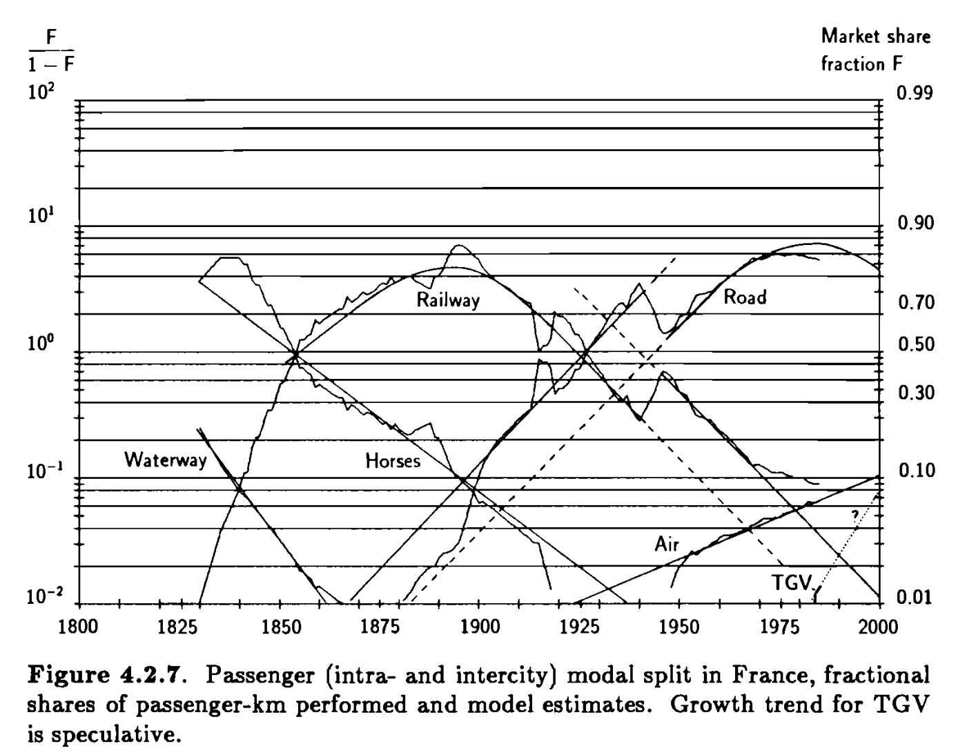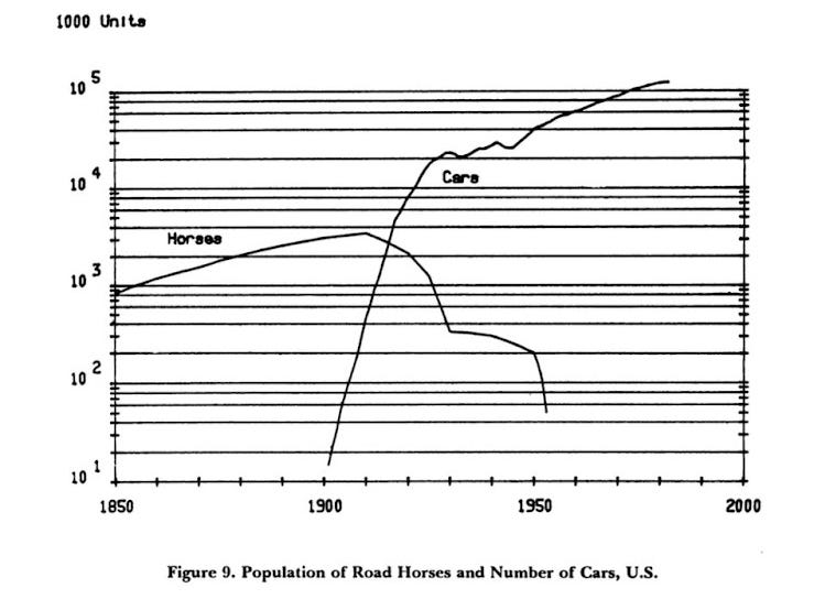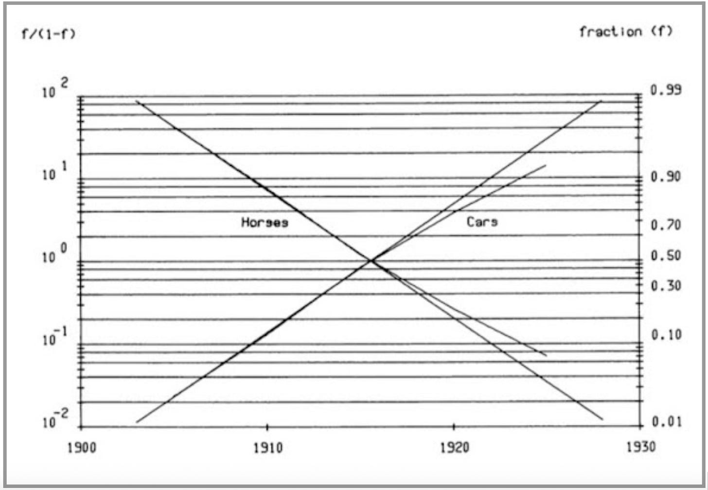 Not only are Grubler and Nakićenović looking for regularity, they are looking for ‘substitution’. Take a famous example; that the car replaced the horse. Grubler and Nakićenović represent horses and cars as a share of the total ‘market’, which is taken to be the sum of horses and cars (see figure 6). (When someone tells you that you can’t compare apples and oranges feel free to reply that you can because some Professors freely add up horses and cars).