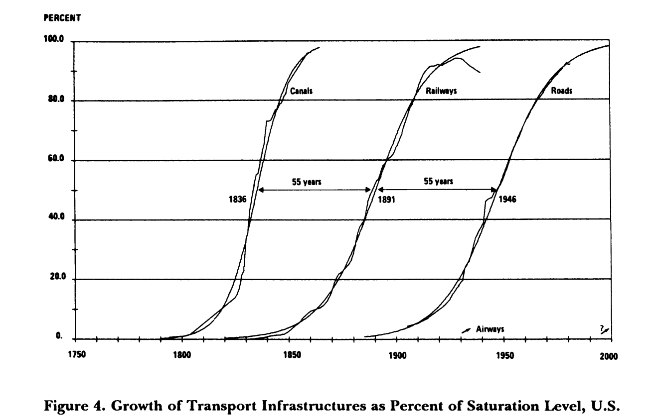Imagine you are back in 1855 in the USA. At that point in time the railway network has been growing every year since 1830, but the canal network has not grown for a few years. Armed with the information about the annual growth in canals, could you predict the future development of the US railway network? Of course you couldn’t. And knowing about Georgian turnpike roads, Venetian canals, or Roman roads, would be equally as useless. Past ‘s-curves’ wouldn’t save you from doing the hard work of analysing the nature of rail as a technology, and using your imagination to make some informed guesses about the role it might play in the US economy.