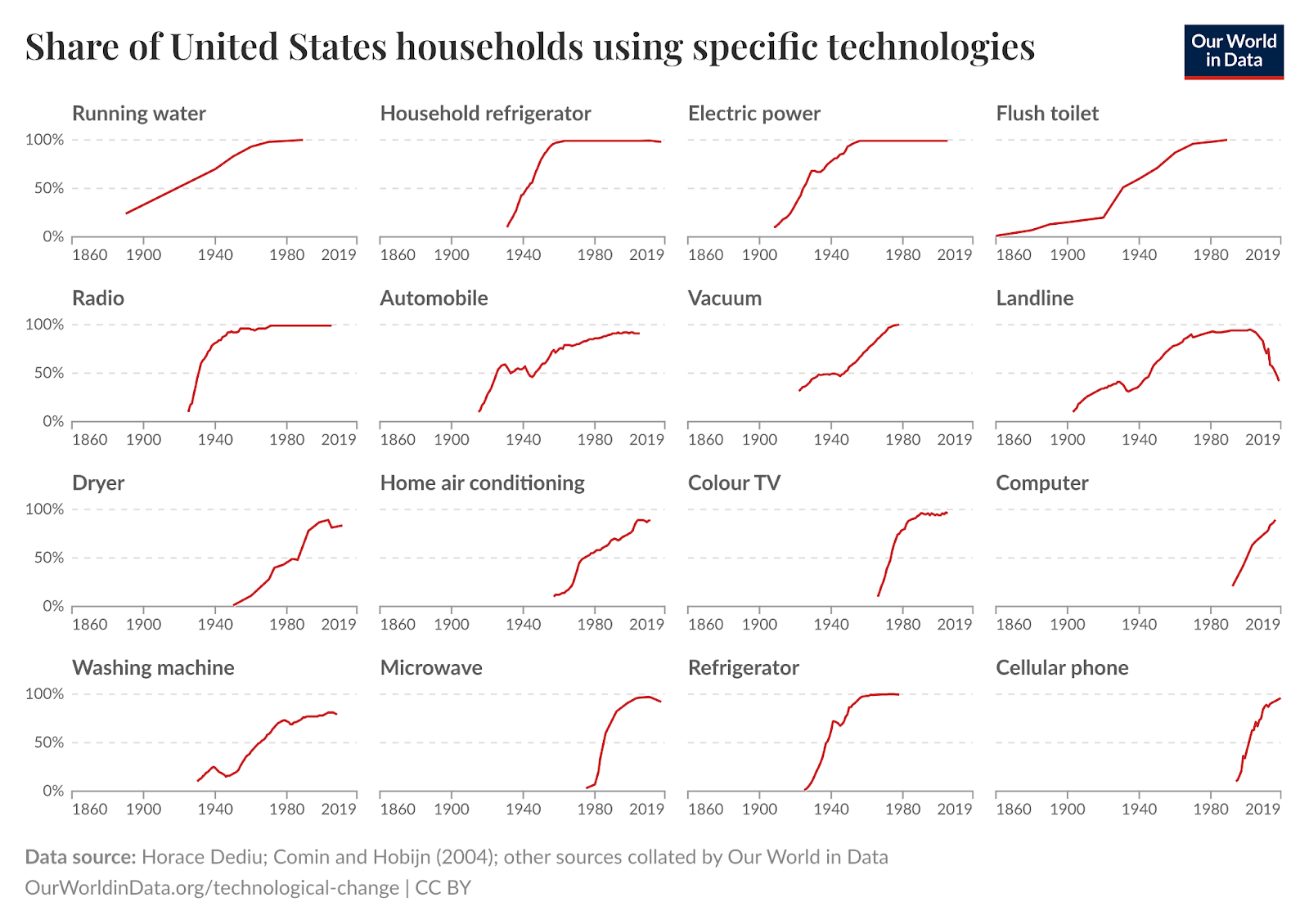 Figure 3 shows the diffusion of twelve technologies in the United States over the 20th century. Some have an ‘s-curve’ pattern (aircon, flush toilets, microwaves). However some do not. Some of the curves are linear and then slow down (e.g. radios and cell phones). Some are just wiggly (automobiles, landlines, washing machines). This of course suffers from survivorship bias. These are just the technologies that became ubiquitous. What about the likes of the minidisk, the TIVO, or the steam powered car? Data on failed technologies is hard to find so I don’t know what their curves looked like.